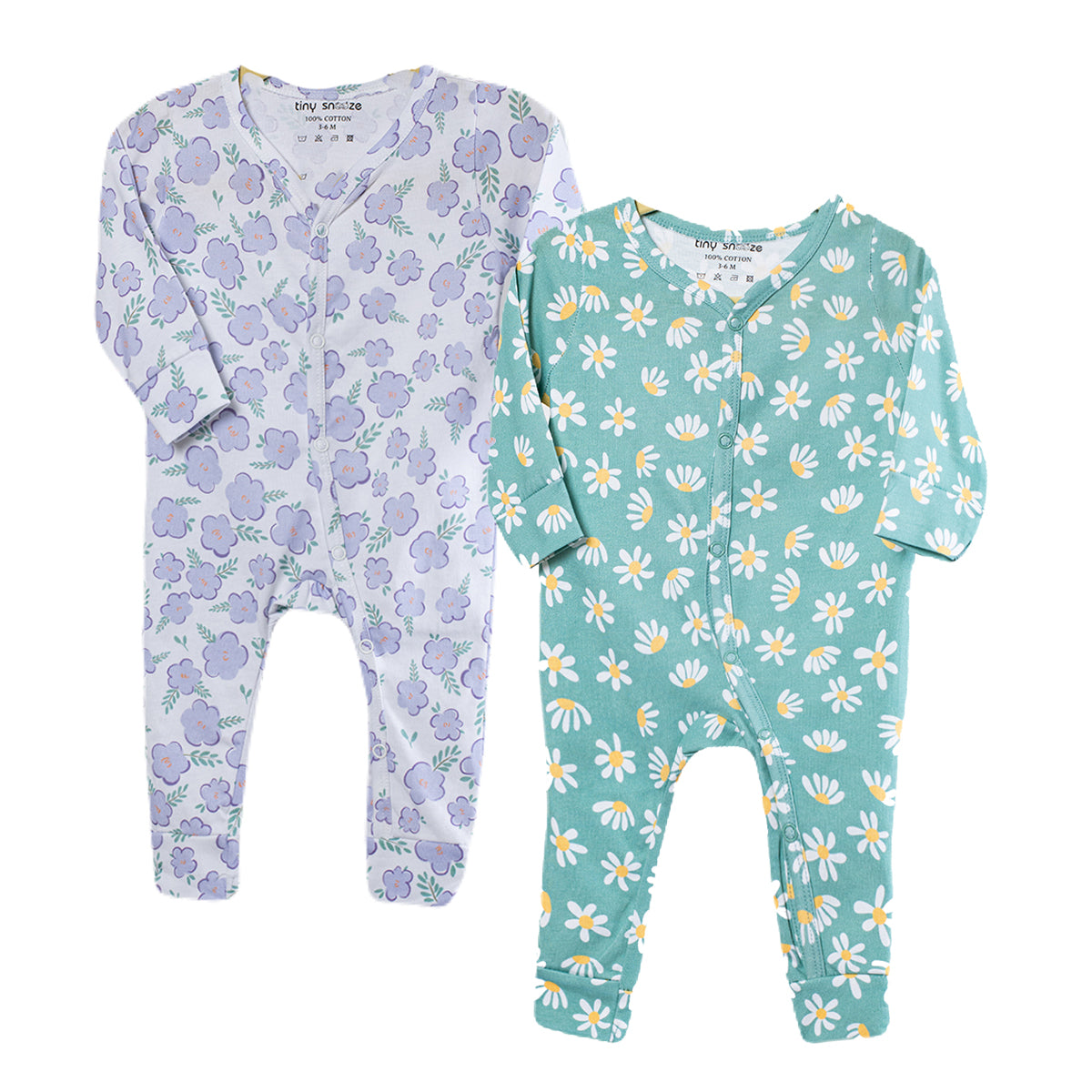 Baby sleepsuit in supersoft cotton fabric with an all-over print. Long sleeves with trims at the cuffs and long legs with cuffed hems. Press buttons down the front and one leg for easy diaper changing specially at night. Ideal all-in-one pajama set for babies during their sleep time.