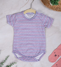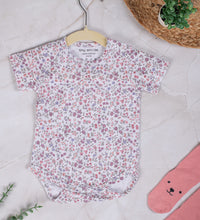 Baby bodysuit with short sleeves in supersoft cotton fabric with press buttons on one shoulder. Press-buttons at the crotch and gathered seams around the legs for a more comfortable and snug fit around the nappy. Convenient and comfortable for diaper changes.
