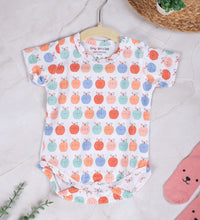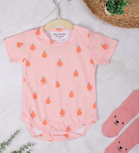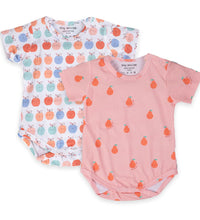 Baby bodysuit with short sleeves in supersoft cotton fabric with press buttons on one shoulder. Press-buttons at the crotch and gathered seams around the legs for a more comfortable and snug fit around the nappy. Convenient and comfortable for diaper changes.
