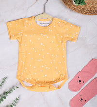 Baby bodysuit with short sleeves in supersoft cotton fabric with press buttons on one shoulder. Press-buttons at the crotch and gathered seams around the legs for a more comfortable and snug fit around the nappy. Convenient and comfortable for diaper changes.