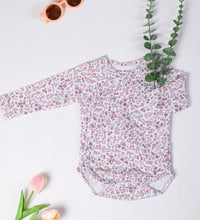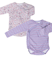 Kimono style bodysuit with long sleeves with a wrapover front. It has press buttons at the sides and bottom. Gathered seams around the legs for a more comfortable and snug fit around the nappy. Convenient and comfortable for diaper changes.