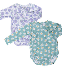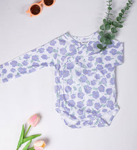 Kimono style bodysuit with long sleeves with a wrapover front. It has press buttons at the sides and bottom. Gathered seams around the legs for a more comfortable and snug fit around the nappy. Convenient and comfortable for diaper changes.