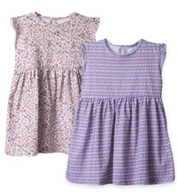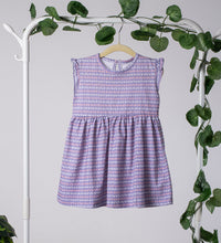 Girls dress in soft, printed cotton fabric with a round neckline, opening with a button at the back and flutter sleeves. Gathers at the waist and a flared skirt. Simple, elegant & comfortable for your lil one.