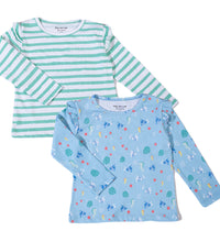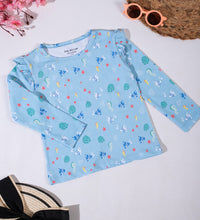 Girls top in soft, printed cotton fabric with a round neckline, ruffle at the shoulders and long sleeves.