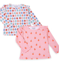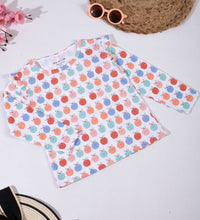 Girls top in soft, printed cotton fabric with a round neckline, ruffle at the shoulders and long sleeves.