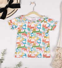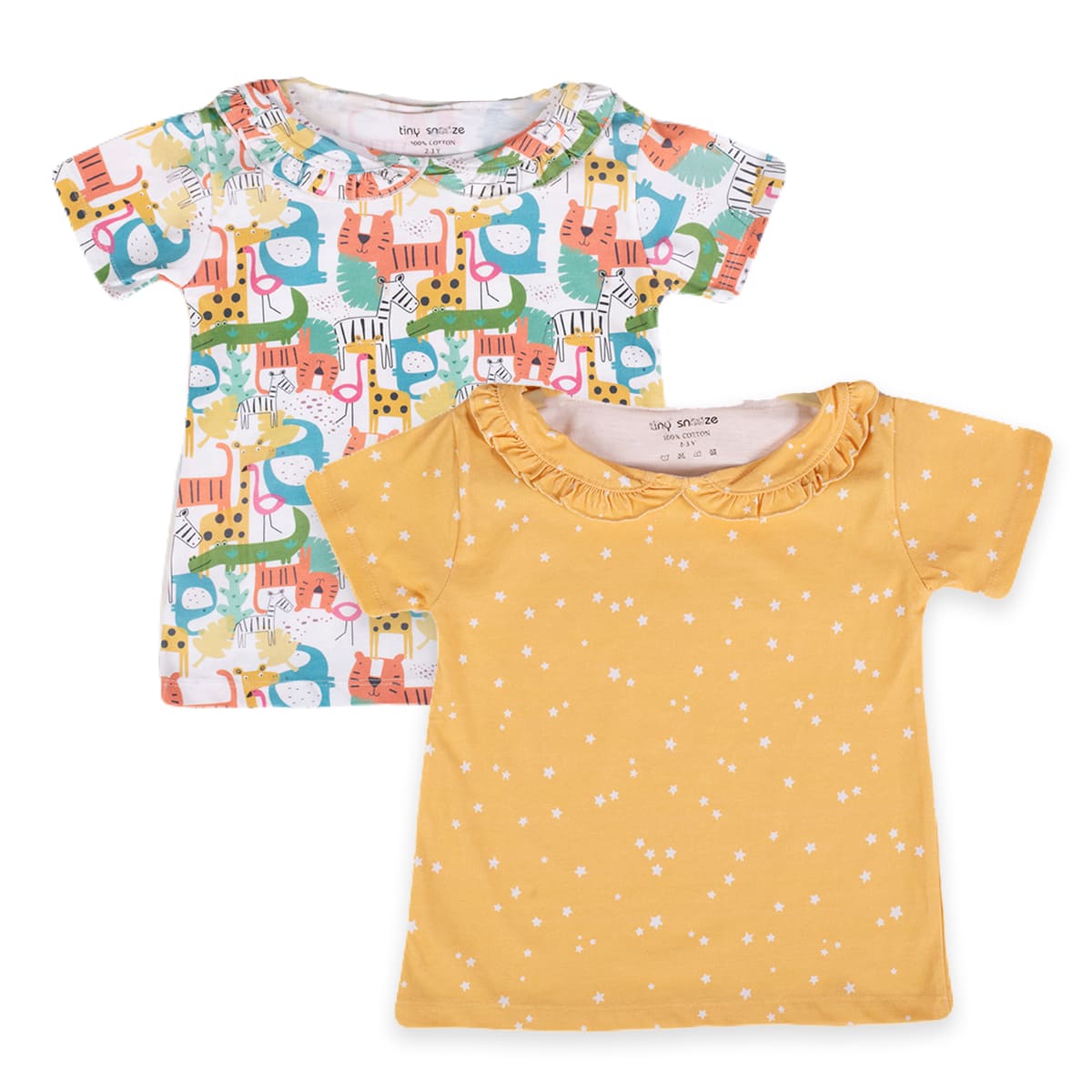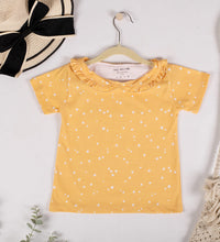 Girls top in soft, printed cotton fabric with a round neckline, scalloped collar and short sleeves.