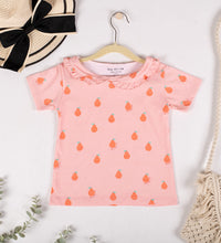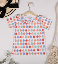 Girls top in soft, printed cotton fabric with a round neckline, scalloped collar and short sleeves.