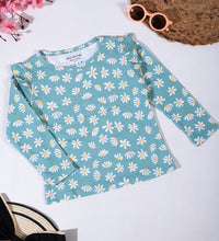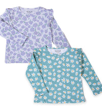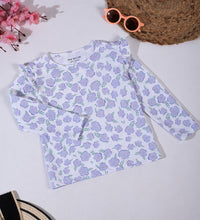 Girls top in soft, printed cotton fabric with a round neckline, ruffle at the shoulders and long sleeves.