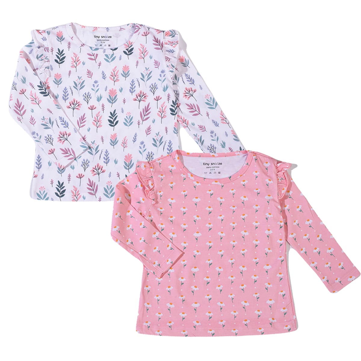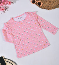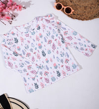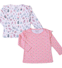 Girls top in soft, printed cotton fabric with a round neckline, ruffle at the shoulders and long sleeves.