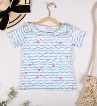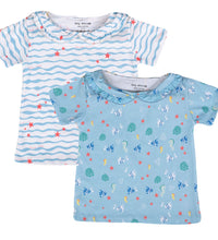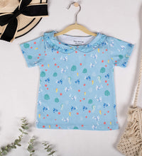 Girls top in soft, printed cotton fabric with a round neckline, scalloped collar and short sleeves.