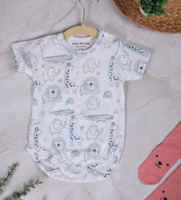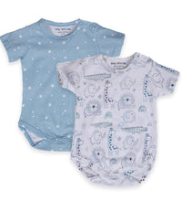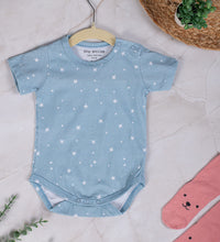 Baby bodysuit with short sleeves in supersoft cotton fabric with press buttons on one shoulder. Press-buttons at the crotch and gathered seams around the legs for a more comfortable and snug fit around the nappy. Convenient and comfortable for diaper changes.