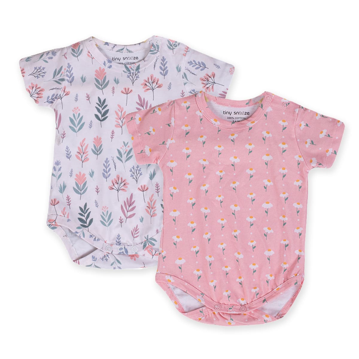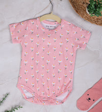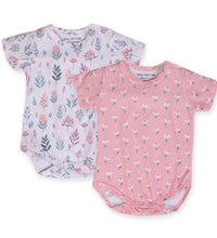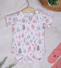 Baby bodysuit with short sleeves in supersoft cotton fabric with press buttons on one shoulder. Press-buttons at the crotch and gathered seams around the legs for a more comfortable and snug fit around the nappy. Convenient and comfortable for diaper changes.