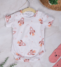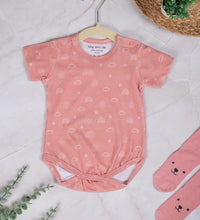 Baby bodysuit with short sleeves in supersoft cotton fabric with press buttons on one shoulder. Press-buttons at the crotch and gathered seams around the legs for a more comfortable and snug fit around the nappy. Convenient and comfortable for diaper changes.
