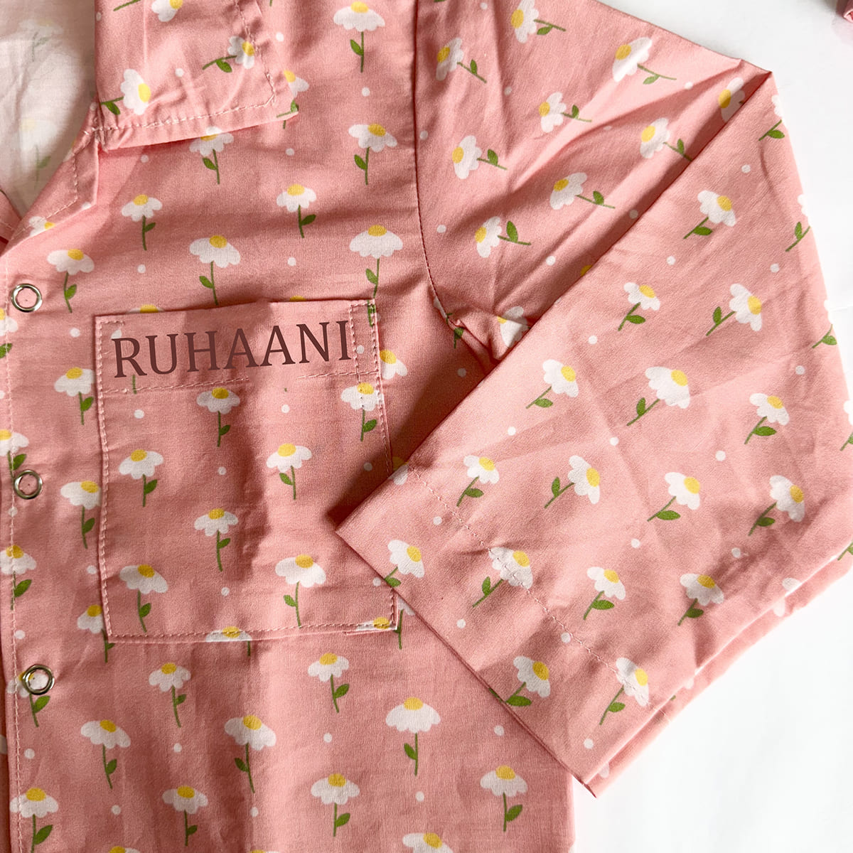 The set comes with a comfortable elastic waist pant & a full sleeve shirt with a pocket and front opening.