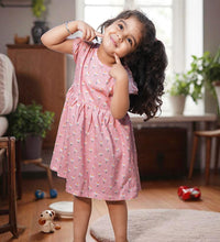 Girls dress in soft, printed cotton fabric with a round neckline, opening with a button at the back and flutter sleeves. Gathers at the waist and a flared skirt. Simple, elegant & comfortable for your lil one.