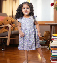 Girls dress in soft, printed cotton fabric with a round neckline, opening with a button at the back and flutter sleeves. Gathers at the waist and a flared skirt. Simple, elegant & comfortable for your lil one.