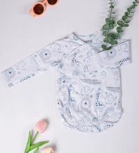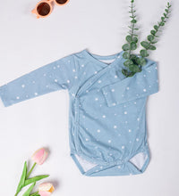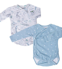Kimono style bodysuit with long sleeves with a wrapover front. It has press buttons at the sides and bottom. Gathered seams around the legs for a more comfortable and snug fit around the nappy. Convenient and comfortable for diaper changes.