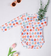 Kimono style bodysuit with long sleeves with a wrapover front. It has press buttons at the sides and bottom. Gathered seams around the legs for a more comfortable and snug fit around the nappy. Convenient and comfortable for diaper changes.